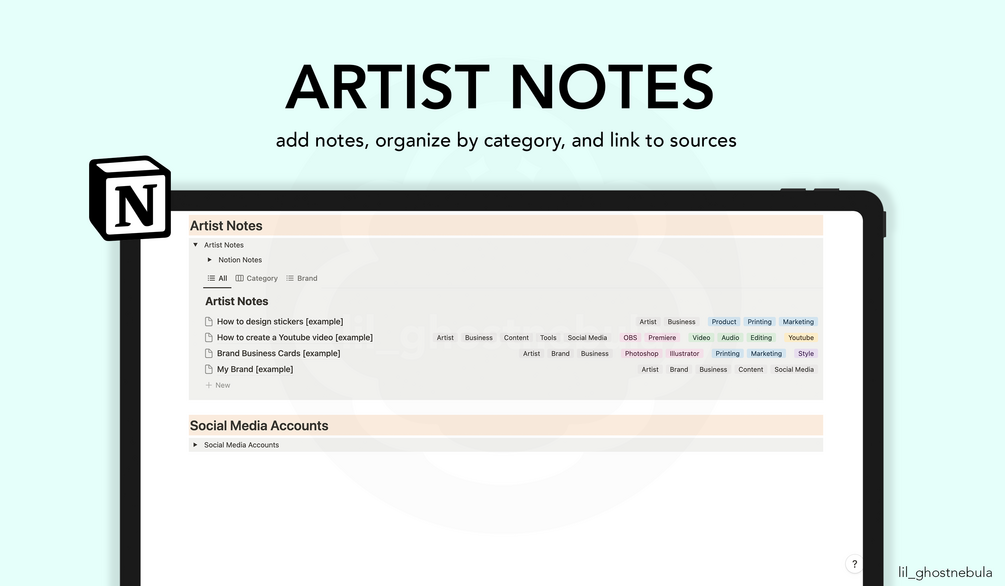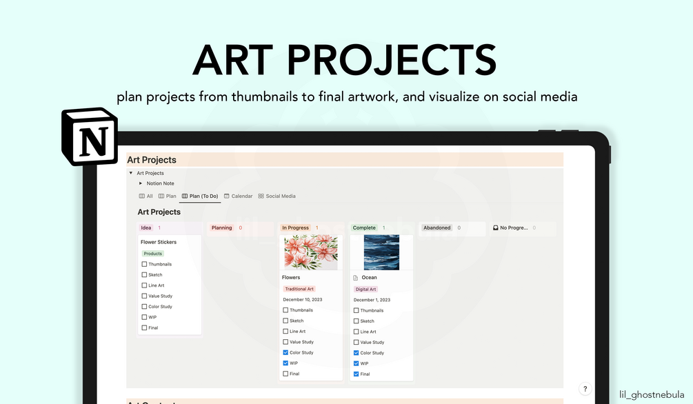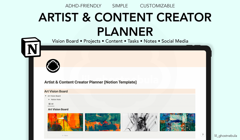Start your content creation journey, your art business, or just organize your art projects with this workspace!