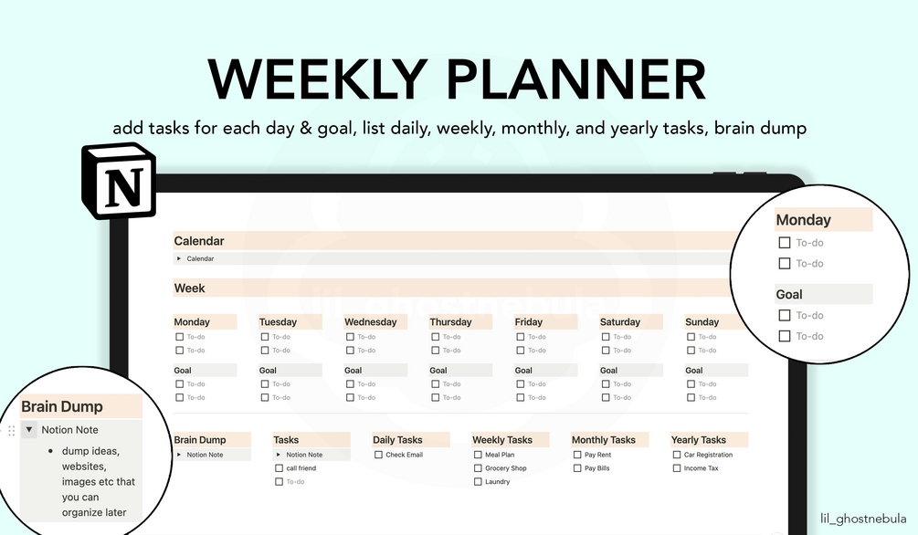 ✨Weekly Planner - add tasks for each day & goal, brain dump